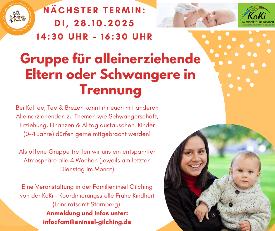 Ca. alle 6-8 Wochen treffen sich im Familiencafé Alleinerziehende mit ihren Babys/Kleinkindern, um sich auszutauschen und neue Kontakte zu knüpfen. Alle Themen rund um den Alltag mit Babys und Kleinkindern finden hier Platz. Dieser Treff ist eine Veranstaltung von KoKi-Netzwerk Frühe Kindheit. Termine, Infos und Anmeldung:
