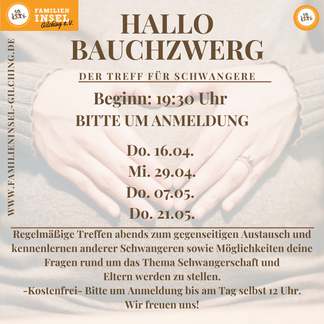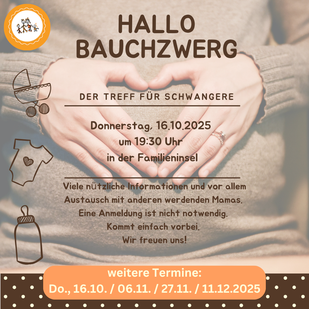 ‘Bei unserem “Hallo, Bauchzwerg!” Treff für Schwangere besprechen wir alle Themen, die werdende Mamas beschäftigen. Besonders wichtig sind uns der Austausch unter euch sowie die Möglichkeit, andere Schwangere in deiner Umgebung kennenzulernen. Du erfährst alles Wichtige für die erste Zeit mit deinem Baby von Erstausstattung, über Stillen bis hin zu Babykursen. (Einstieg jederzeit möglich, ohne Anmeldung!)