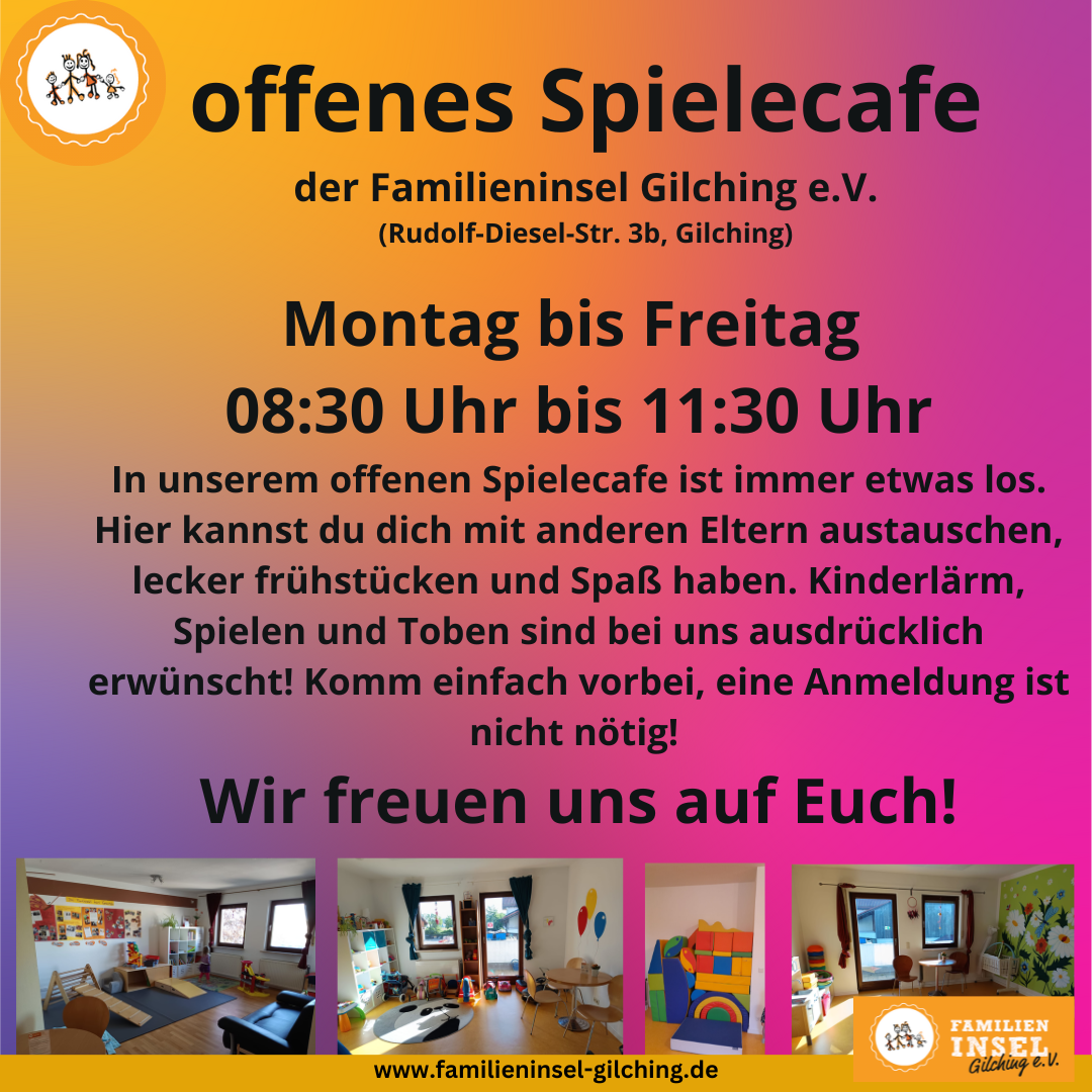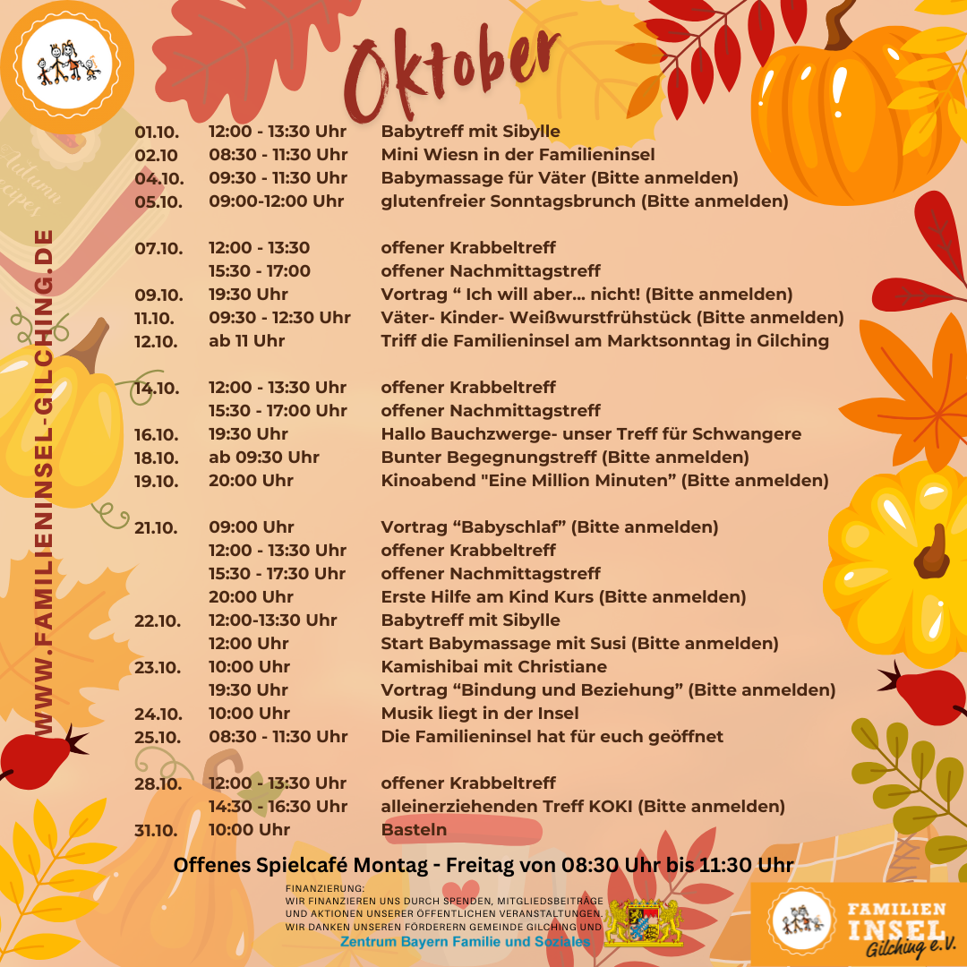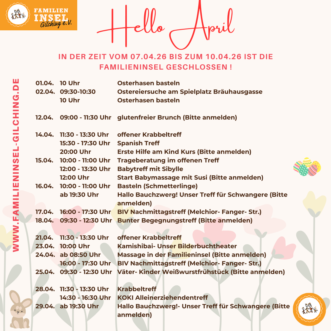 Die meisten Veranstaltungen finden in der Familieninsel im Familiencafé statt und sind überwiegend kostenlos (wo Teilnehmergebühren anfallen ist die Höhe der Kursgebühr beim Kurs vermerkt). Unser Programm steht allen Eltern offen – auch “Nicht-Gilchinger” sind herzlich Willkommen.