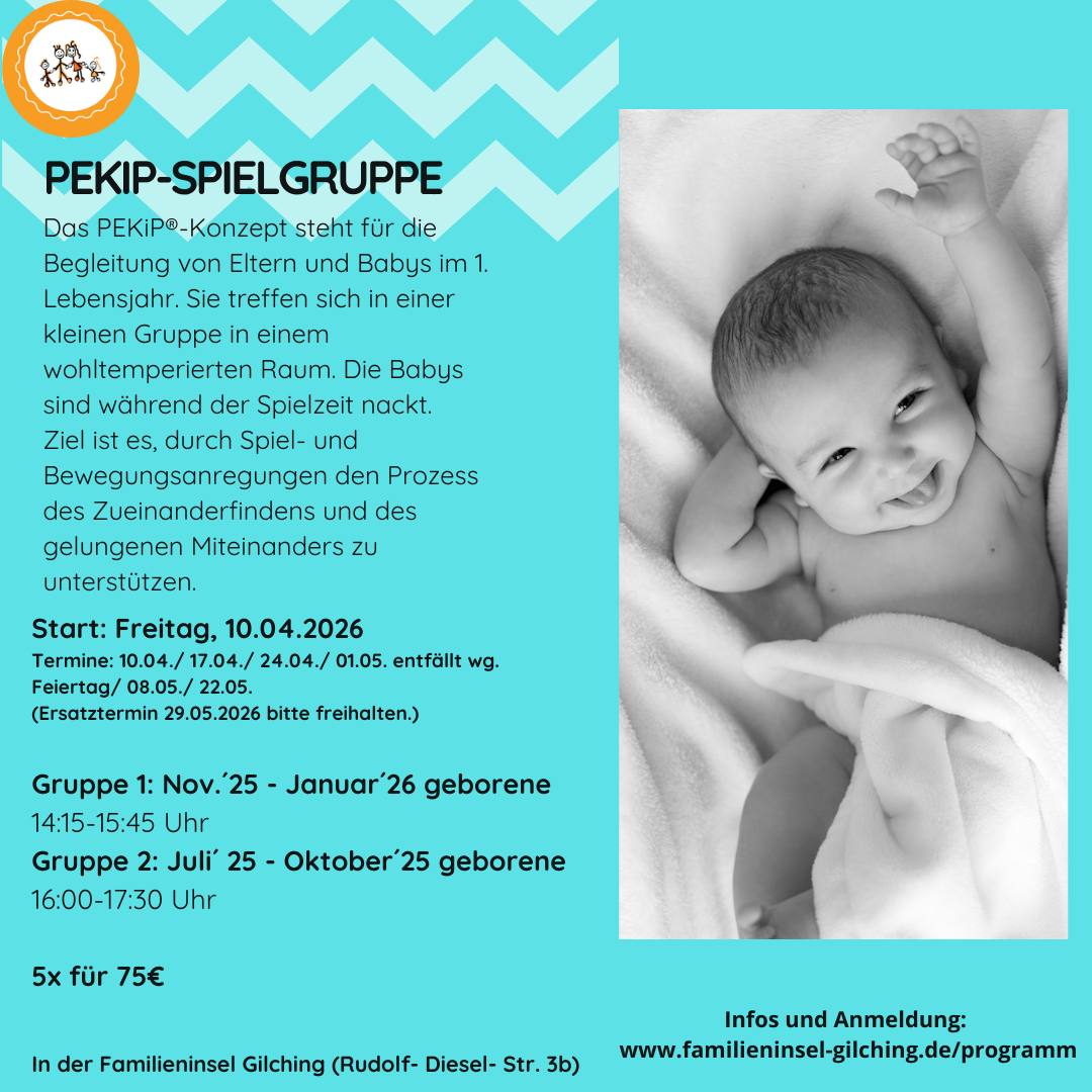 Das PEKiP®-Konzept steht für die Begleitung von Eltern und Babys im 1. Lebensjahr. Sie treffen sich in einer kleinen Gruppe in einem wohltemperierten Raum. Die Babys sind während der Spielzeit nackt.